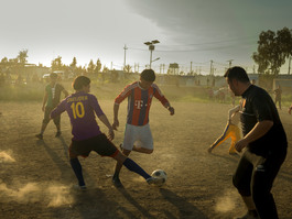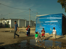 IRAQ. 2016. People watching a football match in a refugee camp...