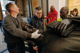 CE. Paris, the 15th of april 2025. Moving the statues of the...