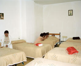Spain. Galicia. 2016. Montse in bed at the congregation's summer...