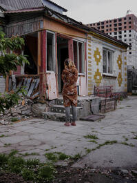 UKRAINE. 2022. In Butcha, a local resident in front of the house...