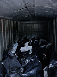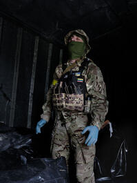 UKAINE. Kharkiv. May 2022. A Ukrainian soldier in a refrigerated...