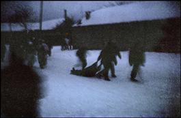 02/2000. Alkhan-Kala. Chechen fighters drag a fallen comrade....
