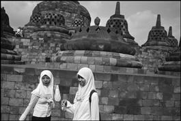 INDONESIA. Borubudur. Two Muslim girls, their head covered by...