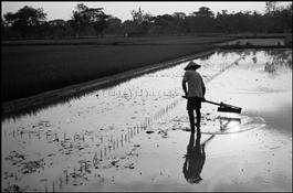 INDONESIA, Near Yogyakarta. A peasant prepares his field for...