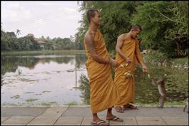 THAILAND. Yala. Bhuddist monks feed a monkey at Phra Bhudda Saiyart...