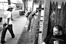 USA. Rochester, NY. 2012. People at a street corner of the Crescent...