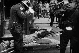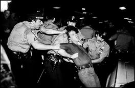 USA. New York City. 1979. A demonstrator refused to stop blocking...