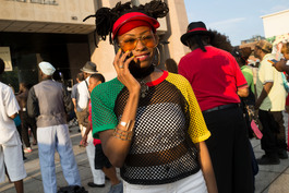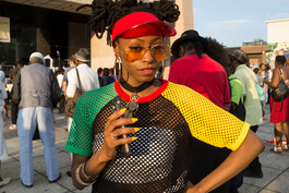 USA. Harlem, NYC. 2017. Regina buying shades on 125th St.