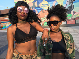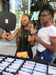 USA. Harlem, NYC. 2017. Regina & Reiquita buying shades on 125th...