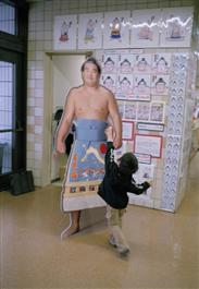 JAPAN. Tokyo. Inside the Kokugikan at a charity event sumo wrestlers...