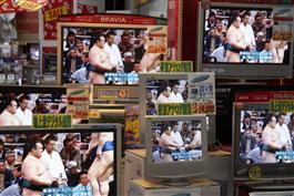 JAPAN. Tokyo. Sumo tournament on TV. 2006.