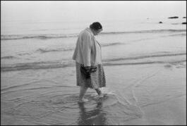 ENGLAND. Brighton. 1960. Woman in black on stone beach.