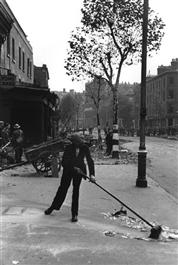 G.B. ENGLAND. London. Shopkeeper sweeps up broken glass from...