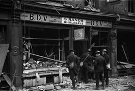 GB. London. The Blitz. Shopkeeper sweeps up broken glass from...