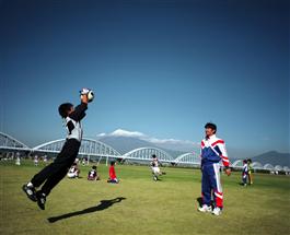 JAPAN. Mt Fuji. Football coaching by Fujigawa River. 1998.