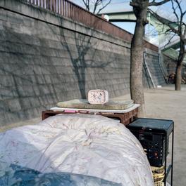 Japan. Osaka. A homeless person's makeshift home in a small piece...