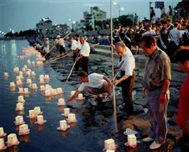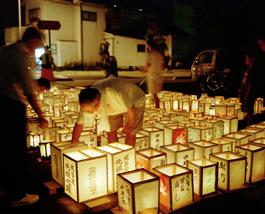 JAPAN. Shimane Prefecture. Lighting paper lanterns, which will...
