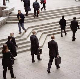 G.B. England. London. Docklands light railway, walking to work...