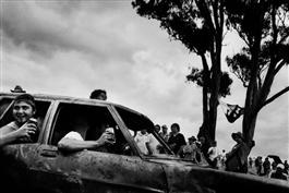 Every year in October thousands of motor racing fans make the trip to Mount Panarama for the Bathurst V8 car races in N.S.W, Australia. Fans camp on top of the mountain and when the action on the real circuit cools down the spectators create their own forms of entertainment around makeshift muddy racetracks. Intoxicated by alcohol, revellers smash their own cars into trees and other vehicles until they are damaged beyond repair. The cars are then rolled and burnt in a sort of life ending ritual. From the base of the mountain black smoke can be seen billowing high into the air...
