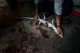 MEXICO. Veracuz, Tlacotalpan. 2016. A man holds a Mexican crocodile...