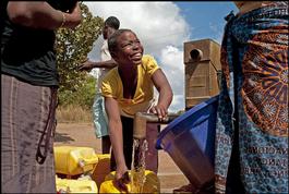 Africa. Mozambique. Namialo. A child fills his jerry cans...