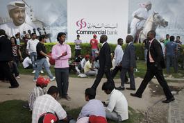 QATAR. Doha. 2012. South Asian laborers gather at a Western Union...