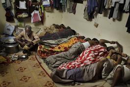 UNITED ARAB EMIRATES. Dubai. 2012. Workers praying in their shared...