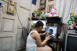 PHILIPPINES. Manila. 2013. Jesus Julian (9y) skypes with his...
