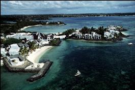 View of tourist hotels on the beach at Touesrok, Mauritius, 1992....