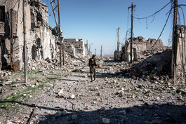 IRAQ. Sinjar. November 18, 2015. A man carries a TV set salvaged...