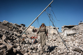 IRAQ. Sinjar. November 18, 2015. A PKK fighter stands in the...