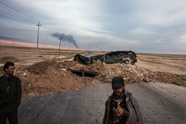 IRAQ. Sinjar. November 15, 2015. The wreckage of a car remains...