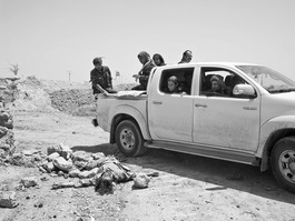SYRIA. Tel Hama. May 19, 2015. Kurdish YPG fighters drive past...