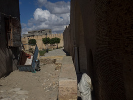 TUNISIA. Kerouan. 2015. A woman walks past the walls surrounding...