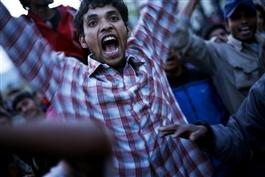 NEPAL. Kathmandu. 2006. Young protesters running and throwing...