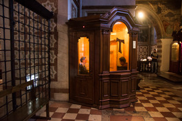 ITALY. Umbria. October 2014. A person stands in a confessional...
