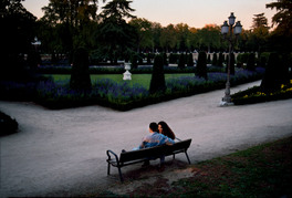 SPAIN. Madrid. October 1995. Couple sit on park bench at dusk....