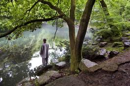 SOUTH KOREA. 2007. A buddhist monk walks in the rain at Seongnisan...