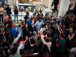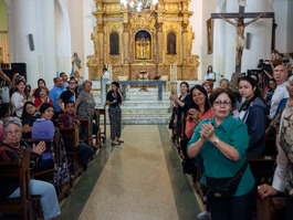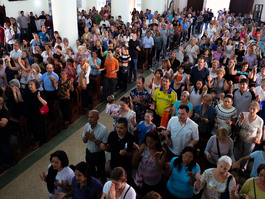 VENEZUELA. Caracas, 2019. People pray during a mass at the San...