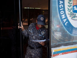 VENEZUELA. Caracas. 2019. A member of the National Police reads...