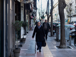 GREECE. Athens. 2019. Debbie and Joe Valencia walking in their...