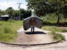 EL SALVADOR. Apopa. 18 September, 2018. A man carries a mattress...
