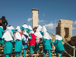 IRAN. Shiraz. 2017. Iranian schoolgirls at the ruins of Persepolis,...