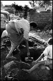 SOUTH AFRICA. 1960s. Earnest boy squats on haunches and strains...