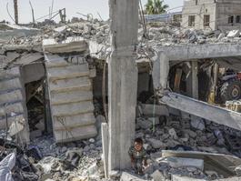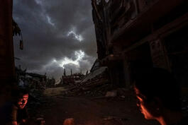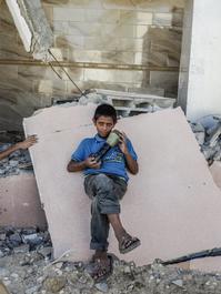 PALESTINE. Gaza. 2014. A child in the ruins of his home in the...