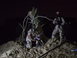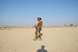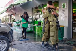 SOUTH ISRAEL. August 5, 2014. Soldiers embrace at a gas station...