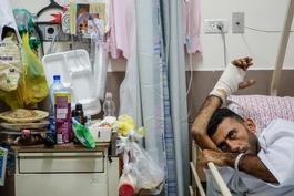 PALESTINE. Gaza. 2014. A man injured during the Israeli ground...