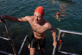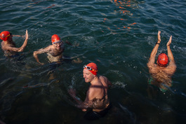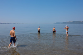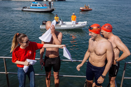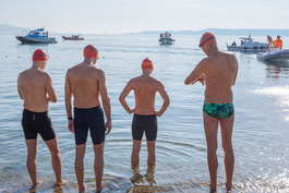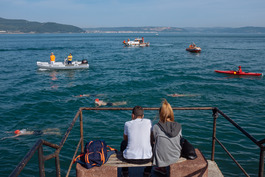 Turkey. Canakkale. 2018. British swimmers at the finish point...
