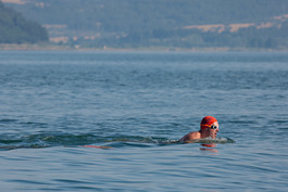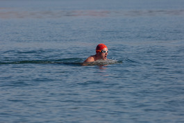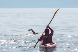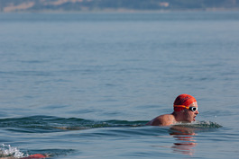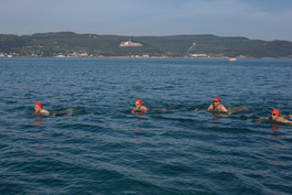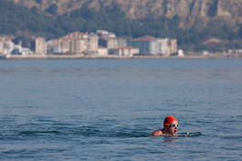 Turkey. Canakkale. 2018. British swimmers swim with security...