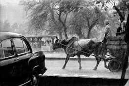 INDIA. Delhi. 2017. A bullock cart walks through the street in...